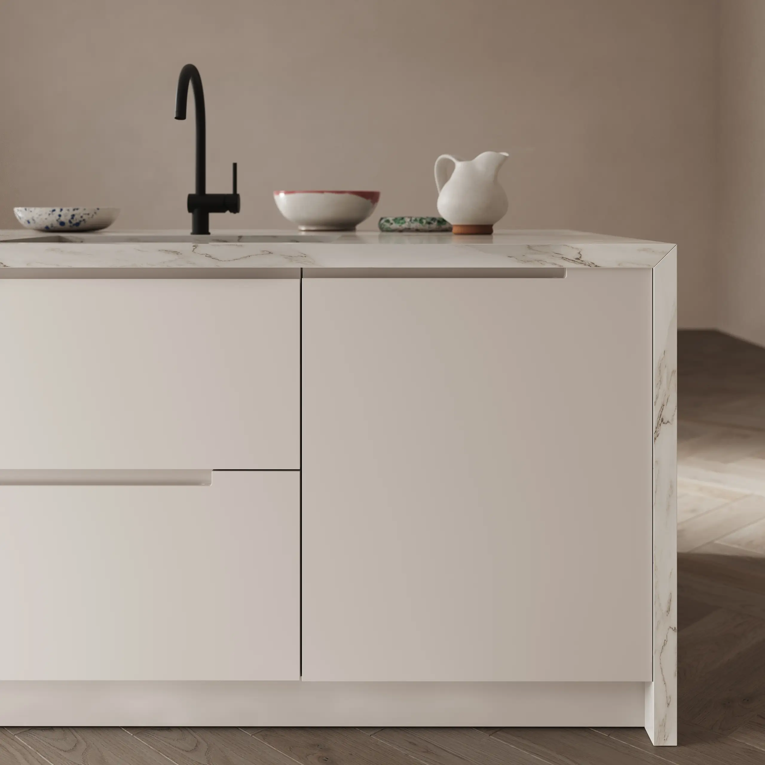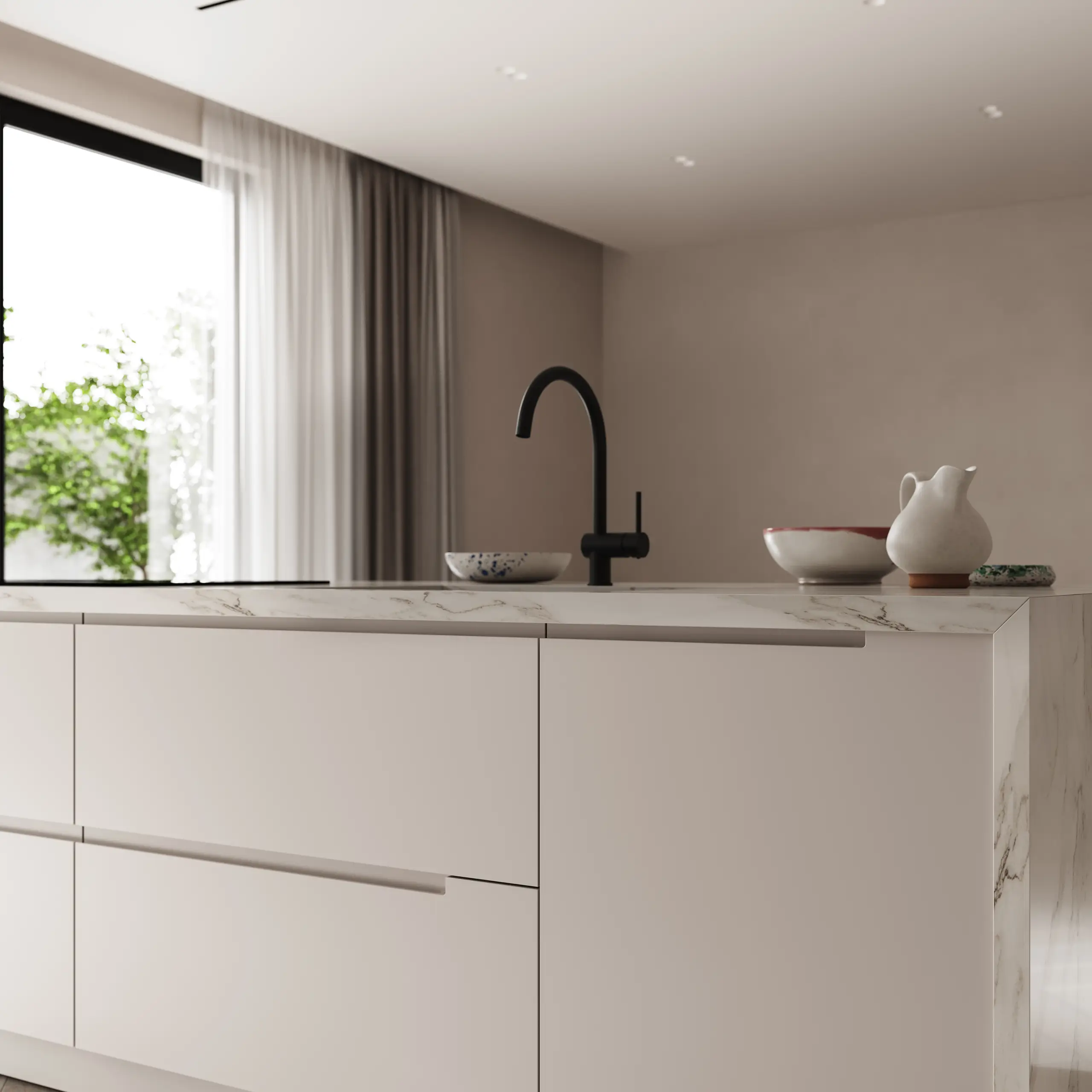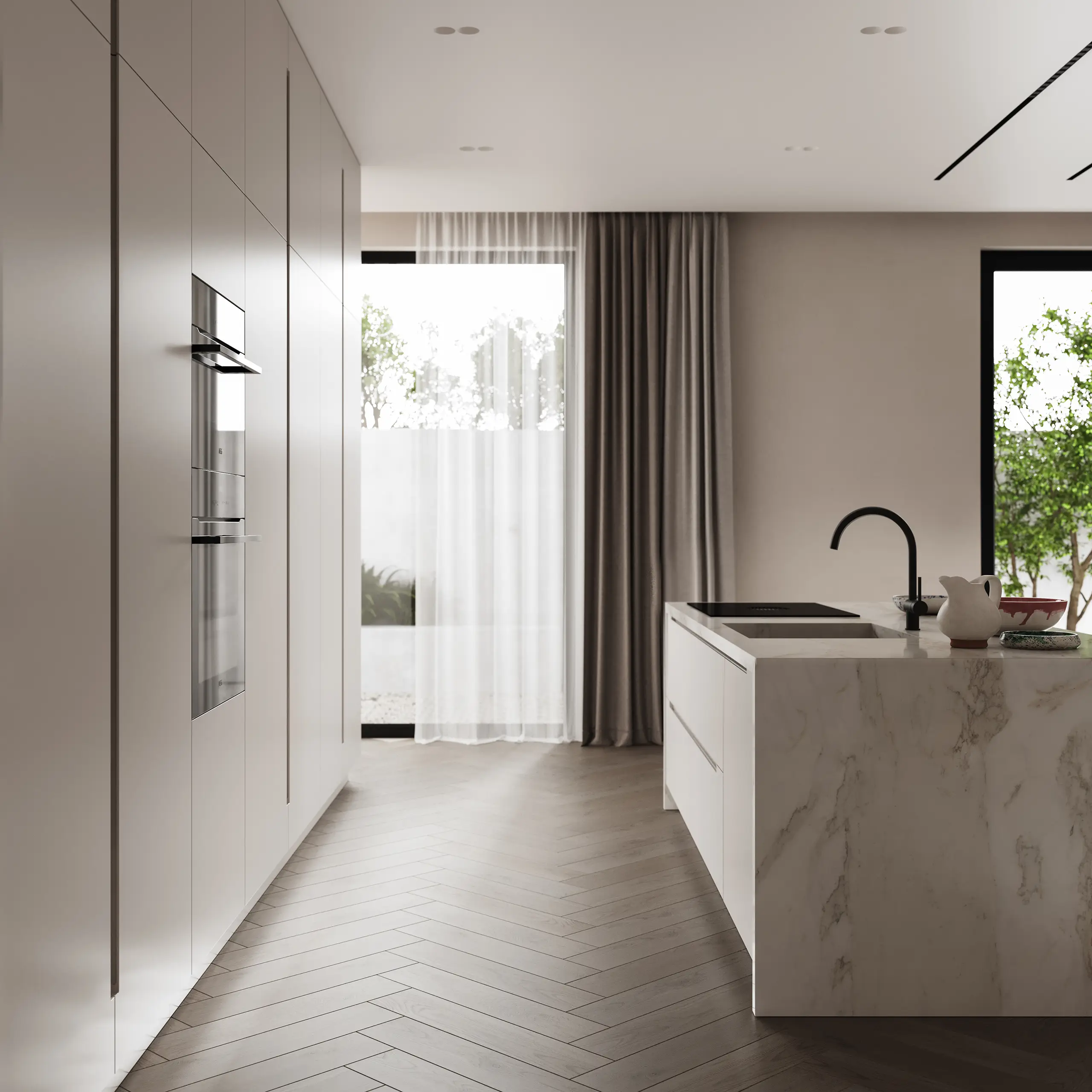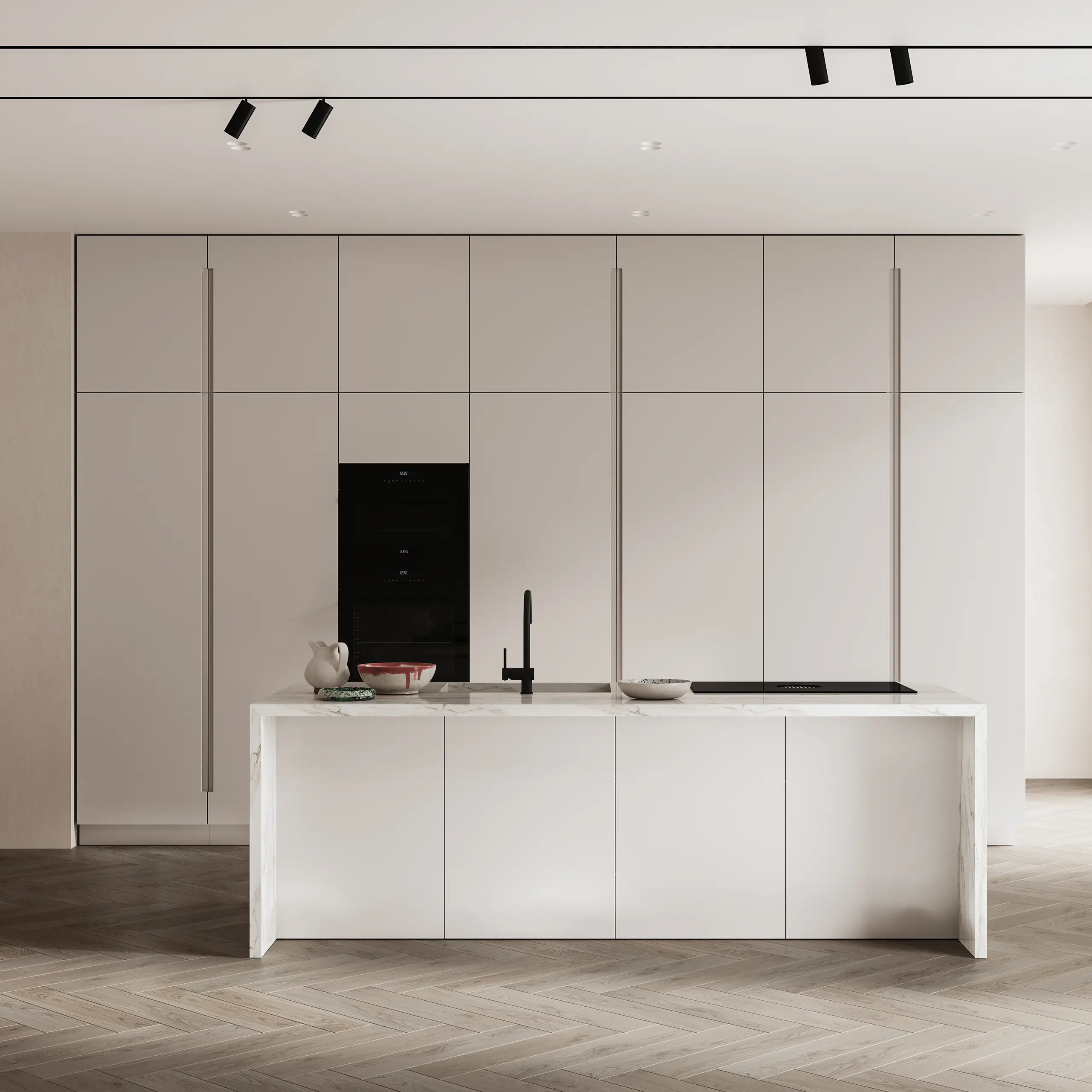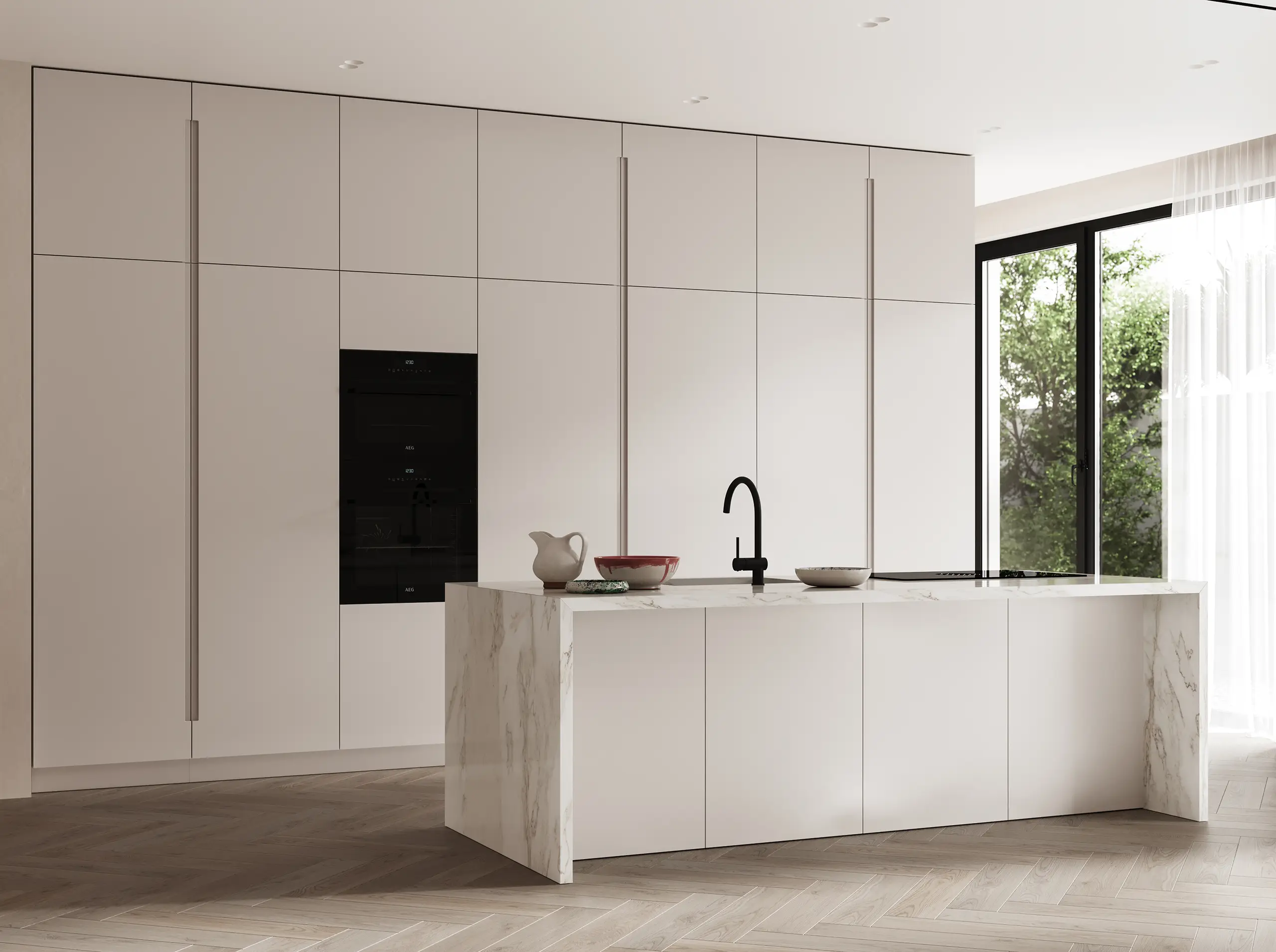 Il sistema di apertura di questa cucina è realizzato attraverso un profili ricavato nell’anta. La finitura proposta è un laccato opaco BIANCO PURO. Il top e i fianchi dell’isola sono in Marmo Calacatta